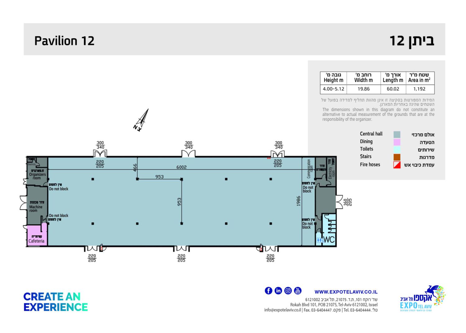 האולם מתאים לקיום אירועי חברה, אירוע פרטי, כנסים, תערוכות וירידים, מבחנים וכו'.